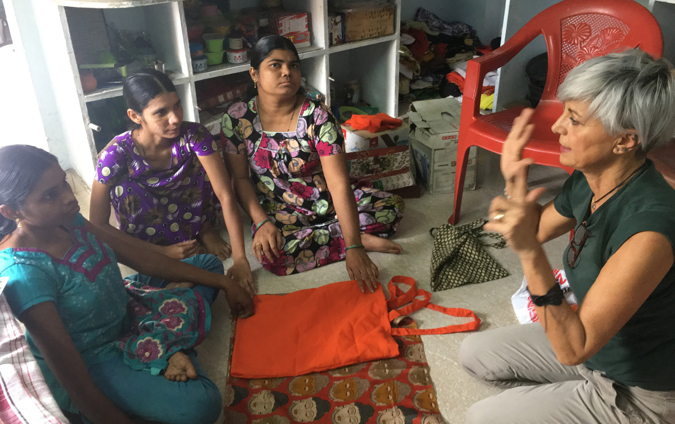 Kanchana e le sue amiche hanno molte limitazioni funzionali a causa della poliomielite, due di loro si muovono solo grazie ad un carrellino con ruote. Vivono in due stanze al primo piano. Le scale di accesso alla loro umile casa rappresentano una barriera architettonica importante che non consente l’integrazione ma che al tempo stesso protegge dagli sguardi delle persone “normodotate” che generano vergogna e sono spesso difficili da sostenere. Ci accolgono con gioia, motivate ad imparare nuovi modi per ricamare e cucire.